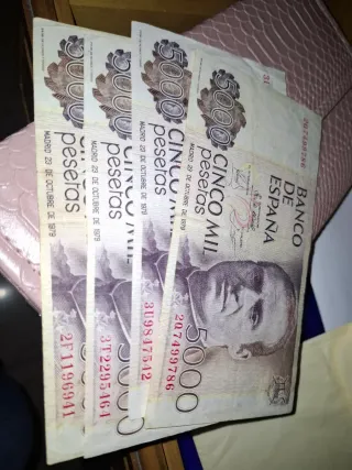 Lote de cuatro billetes de 5000 pesetas del año 1979. - Billetes de colección. - Serie 2F1196941. - Serie 3T2295464. - Serie 3U9847542. - Serie 2Q7499786.