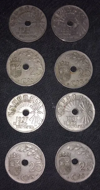 Vendo lote de monedas antiguas. -20 monedas de 5 pesetas (10 de Juan Carlos 1975, 10 de Franco 1957. -20 monedas de 10 céntimos de 1959. -20 monedas de 1 peseta (1953/1975). -45 monedas de 10 céntimos (1940/1953). -8 monedas de 25 céntimos de 1937.