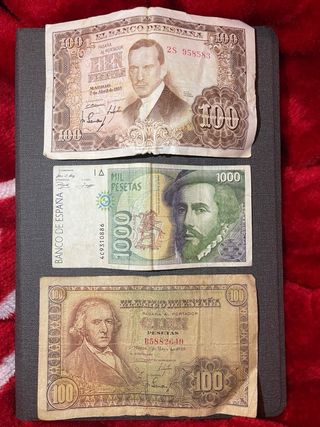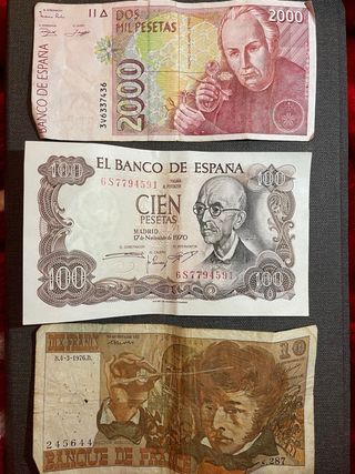 Conjunto de billetes antiguos. - Un billete de 2000 pesetas del Banco de España. - Un billete de 100 pesetas del Banco de España. - Un billete de 10 Francos de Banque de France. - tengo barrio de cada una.