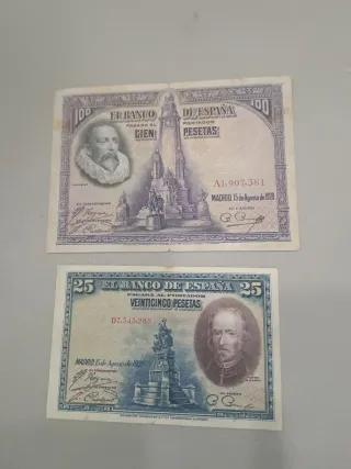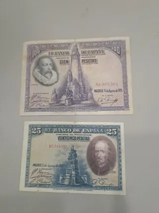 Conjunto de dos billetes del Banco de España, uno de 100 pesetas y otro de 25 pesetas. 20€ los dos - Billetes de colección. - Incluye un billete de 100 pesetas con retrato de Cervantes. - Incluye un billete de 25 pesetas con retrato de un personaje histórico. - Ambos billetes datan de 1928.