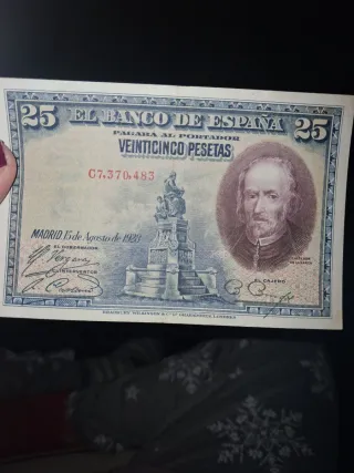 Billete de 25 pesetas del Banco de España, emitido en Madrid el 15 de agosto de 1928. Presenta un retrato de Calderón de la Barca. - Serie: C - Número de serie: 7.370.483 - Grabado por Bradbury, Wilkinson & Co. L.P. en Londres.