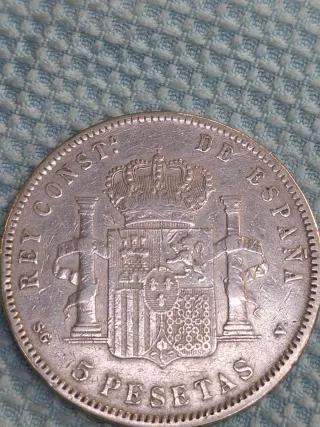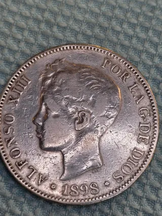 Moneda de 5 pesetas de Alfonso XIII acuñada en 1898. Visible los primeros dos numeros 18 - Anverso: Retrato de Alfonso XIII. - Reverso: Escudo de España. - Canto: Estrellas y leyendas.