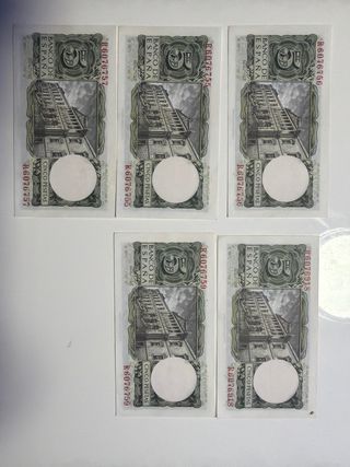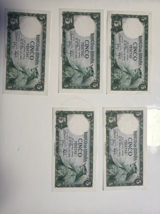 Conjunto de cinco billetes de 5 pesetas del Banco de España, emitidos en 1954. - Serie: 22 de Julio de 1954 - Denominación: 5 Pesetas - Emisor: Banco de España