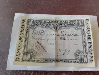 Billete de 1000 pesetas del Banco de España, emitido en Bilbao en 1937. - Valor: 1000 pesetas. - Fecha de emisión: 1 de Enero de 1937. - Lugar de emisión: Bilbao. - Entidad emisora: El Banco de España.