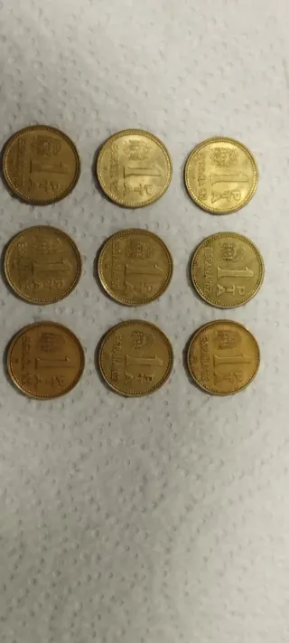 Lote de nueve monedas de 1 peseta de España, acuñadas en el año 1980. - Cada moneda tiene un valor nominal de 1 peseta. - Diseño con el escudo de España y el número 1. - Acabado en color dorado. Con estrellas del 80, 81,82.
