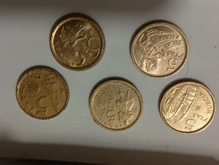 Conjunto de cinco monedas antiguas de España, con diseños variados. Murcia 1999, La Rioja 1996, Aragón 1994, Islas Baleares 1997 y Jacobeo 1993