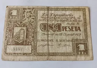 Billete de 1 peseta del Concejo Municipal de Graus, emitido en 1937. - Serie A. - Acuerdo de fecha 28 de agosto de 1937. - Número de serie: 5457. Muy bien conservado Se hacen lotes