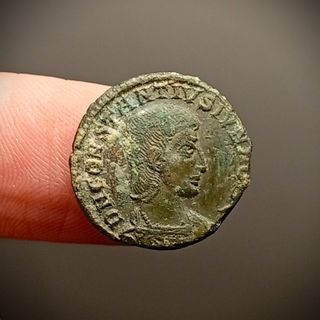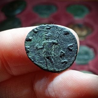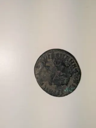 Moneda antigua de origen romano. Presenta un diseño detallado en relieve. - Material: Metal (apariencia antigua). - Diseño: Rostro imperial y símbolos. - Estado: Desgaste propio de la antigüedad.
