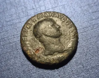 Moneda antigua de Roma, tipo As. Presenta un retrato en relieve y detalles desgastados por el tiempo. - Material: Bronce o similar. - Tipo: As romano.