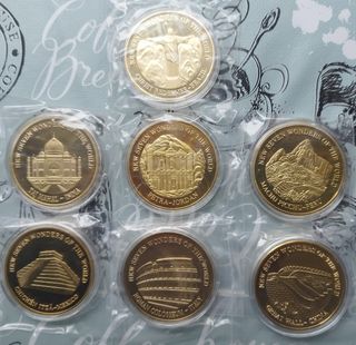 Conjunto de monedas conmemorativas de las Siete Maravillas del Mundo Moderno. - Diámetro de 40 mm. - Cada moneda representa una maravilla diferente. - Cristo Redentor (Brasil) - Taj Mahal (India) - Petra (Jordania) - Machu Picchu (Perú) - Chichén Itzá (México) - Coliseo Romano (Italia) - Gran Muralla China (China)