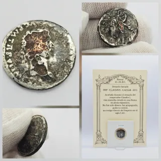 Moneda auténtica del Imperio romano, acuñada durante el reinado del emperador Claudio I, con más de 2.000 años de historia. Denario forrado, con desgaste acorde a su antigüedad y núcleo visible, característico de este tipo de emisiones. Conserva restos de leyenda e iconografía en ambas caras, así como canto original. Pieza honesta, no reproducción, sin limpiezas agresivas. Diámetro: 18 mm Peso: 2,65 gramos Incluye cartel informativo y soporte expositor, lista para exhibición o colección.