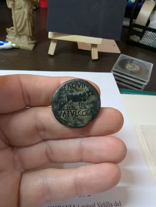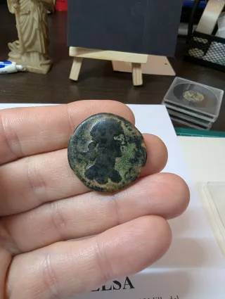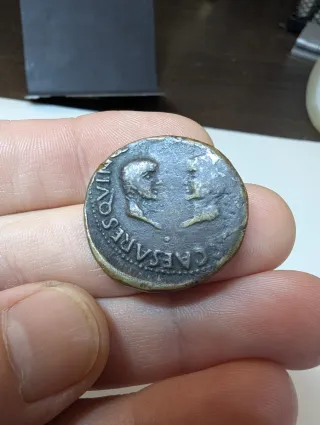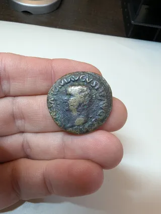 Moneda antigua romana con la efigie de Augusto. - Inscripción: CAESAR AVGVSTVS - Inscripción: DIVVS F (posiblemente) - Material: Bronce