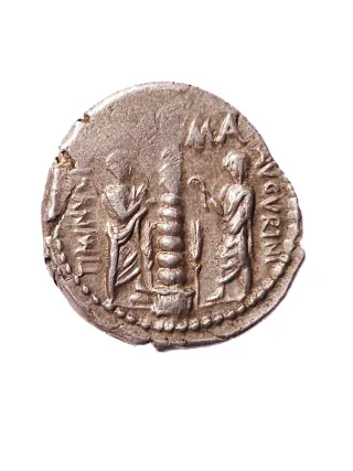Moneda auténtica de la República Romana, denario de plata acuñado en el año 134 a.C. Más de 2.150 años de historia real en una sola moneda. Peso: 3,95 g. Diámetro: aprox. 19 mm. Moneda original antigua, no restaurada ni limpiada de forma agresiva, con pátina natural y desgaste acorde a su antigüedad. Anverso: cabeza de Roma con casco (tipo republicano). Reverso: escena ritual con dos figuras togadas flanqueando un altar. Ideal para coleccionistas de monedas antiguas, historia romana o como pieza única de colección. Se entrega protegida.