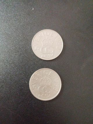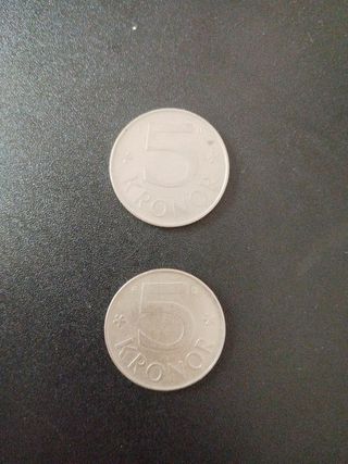 Se venden dos monedas de 5 Kronor suecas. Una es de 1982 y la otra de 1988. Las monedas están en buen estado. - Dos monedas de 5 Kronor. - Años de acuñación: 1982 y 1988. - Monedas suecas.