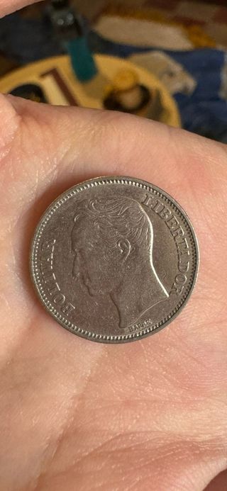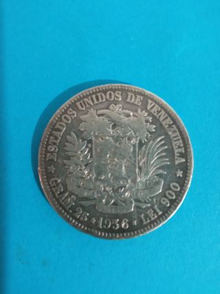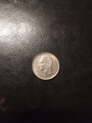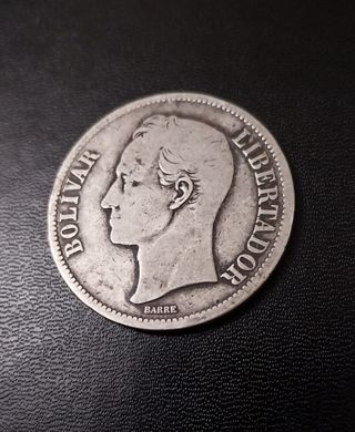 Moneda venezolana circulante de 5 bolívares, 1935, última acuñación de este tipo de moneda. Plata de 900 milésimas, peso: 24,95 gramos.