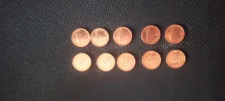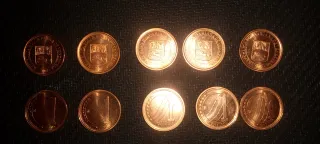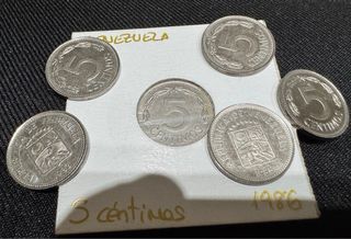 Conjunto de cinco monedas venezolanas de un céntimo del año 2007. - Diseño con el escudo de Venezuela. - Acabado en tono dorado. Set de 5 monedas que como cosas curiosa no llegaron a circular, lo que la hace muy difícil. Todas por €5 Se hacen entregas personales y envíos por correos trabajamos con wallapop.