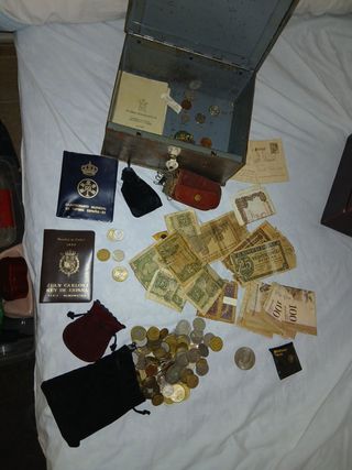 Antigua colección de monedas y billetes de diferentes países y épocas. - Incluye billetes de pesetas españolas y bolívares venezolanos. - Variedad de monedas de euro y otras acuñaciones. - Documentación numismática y postal. - Caja metálica de seguridad con llaves. Precio por todo, escucho ofertas y trueque