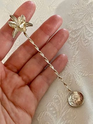Preciosa cucharilla venezolana. Es una moneda del Libertador Bolivar de 1835 y en el mango una flor de orquidea plata y con perlita blanca. Comprada en Caracas (Venezuela). Nueva a estrenar, en su caja original.