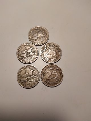 Vendo cinco monedas de 25 céntimos del año 1925.Seis euros la unidad.