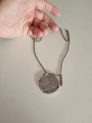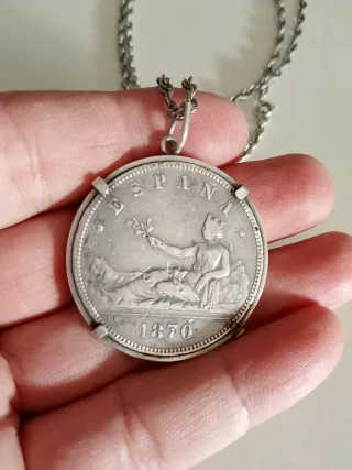 colgante plata y moneda antigua de 5 pesetas España 1870 muy buen estado, vintage y plata, - Moneda de España de plata 1870, - Diseño detallado de figura alegórica. - Cadena de eslabones plata,