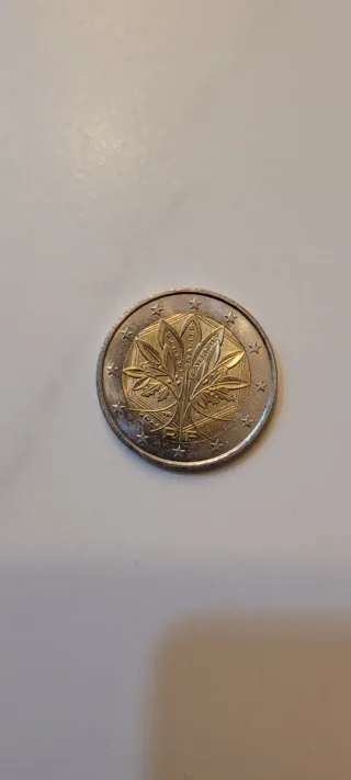 Moneda de 2 euros de Francia. - Diseño con figura humana y símbolo. - Borde con estrellas.