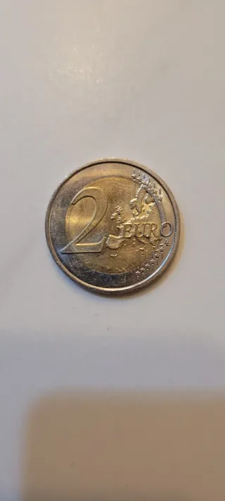 Moneda de 2 euros con borde plateado y centro dorado. Presenta un diseño grabado en el centro. - Borde exterior plateado. - Centro interior dorado. - Grabado detallado en el centro.