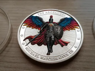 Moneda conmemorativa del Arcángel San Miguel. Encapsulada y con cuatro centímetros de diámetro. Espectacular. No oro, no plata. Precio: 9 euros. - Diseño detallado del Arcángel San Miguel con armadura y alas. - Inscripción THE ARCHANGEL MICHAEL WATCHES OVER US. - Colores vibrantes en las alas y la capa.