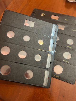 Tres hojas Pardo para colecciones de monedas de euros. - Espacio superior para colocar la bandera del país. - Diseñadas para organizar series de euros. - Cada hoja tiene espacios para diferentes céntimos y euros.