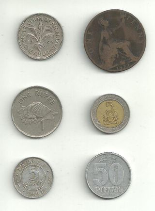 Detalles del producto Lote de monedas que se detalla a continuación: Kenia. 5 Shillings 1997. Gran Bretaña. 1 Penny 1899. Nigeria. 1 Shilling 1959. Alemania, República Democrática. 50 Pfennig 1971. Seychelles. 1 Rupia 1992. Belice. 5 Cents 1991. Se hacen envíos conjuntos. También se pueden comprar monedas sueltas de cada uno de mis lotes al precio de 1 euro cada moneda. Lote número 232.