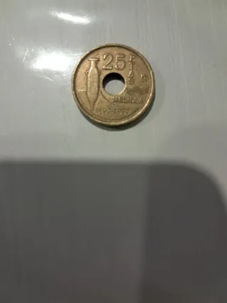 Moneda de 25 pesetas de Ceuta. - Diseño con agujero central. - Inscripción CEUTA en la parte inferior.