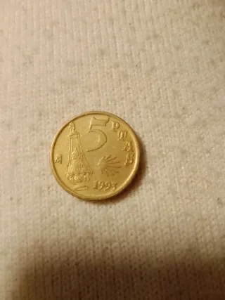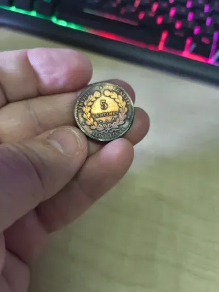 Moneda antigua con el número 5 visible. - Diseño detallado en el anverso. - Borde con relieve.