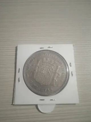 Moneda de 5 pesetas de España. - Diseño con escudo y corona. - Inscripción PTAS y 5 visible.