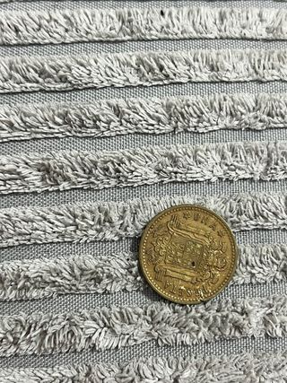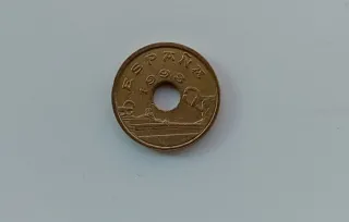 Moneda con un diseño distintivo y un agujero central. - Diseño con figura y elementos gráficos. - Borde con detalles. - Material metálico.