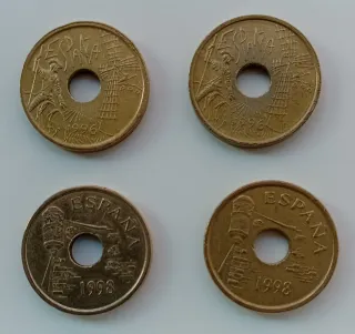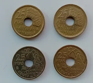 Conjunto de cuatro monedas de 25 pesetas, dos de Castilla-La Mancha y dos de Ceuta. - Dos monedas con diseño de Castilla-La Mancha 1996 - Dos monedas con diseño de Ceuta 1998 - Todas las monedas tienen un agujero central.