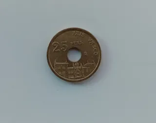 Moneda conmemorativa del País Vasco de 1993. - Valor: 25 Pesetas. - Diseño: Representa un edificio emblemático y el texto PAIS VASCO. - Agujero central característico.