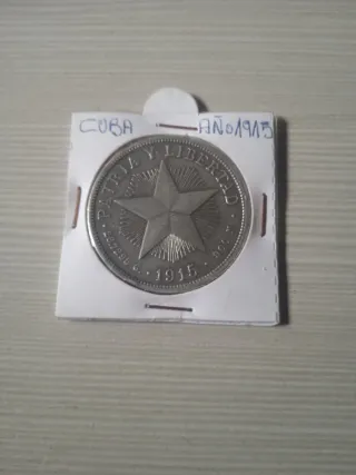 Moneda de plata conmemorativa de Cuba del año 1915. - Diseño Patria y Libertad. - Canto con inscripción 20.296 G. 1915 900 M.