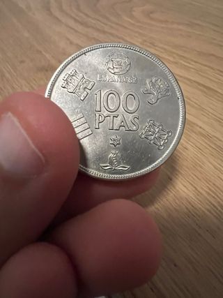 Moneda conmemorativa de 100 pesetas de España, año 1980. - Anverso: Retrato de Juan Carlos I. - Leyenda: CARLOS I REY DE ESPAÑA. - Reverso: Motivo relacionado con el Mundial 82. - Año: 1980.