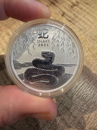 Moneda conmemorativa del Año Lunar 2025, dedicado a la Serpiente. - Diseño detallado de una serpiente enroscada. - Inscripción SNAKE 2025 y carácter chino. - Presentada en su cápsula protectora.