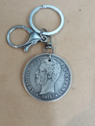 Llavero con una moneda antigua de 1871. - Diseño de moneda con perfil de rey. - De metal no es plata. - Inscripción AMADEO I REY DE ESPAÑA y año 1871. - Incluye anilla y mosquetón para llaves.