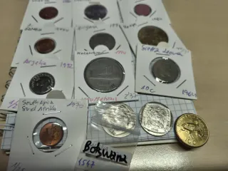 Conjunto de 22 monedas de diferentes países de África. Algunas monedas están protegidas individualmente. - 22 monedas en total. - Variedad de países africanos. - Algunas monedas en protectores individuales. Listado en fotos.