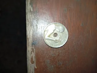 Moneda de la República Española con fecha de 1934. Presenta un diseño con figura humana y un agujero central. - Año: 1934 - Emisor: República Española - Diseño: Figura humana y agujero central