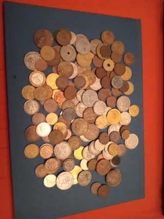 Conjunto variado de monedas de diferentes épocas y orígenes.