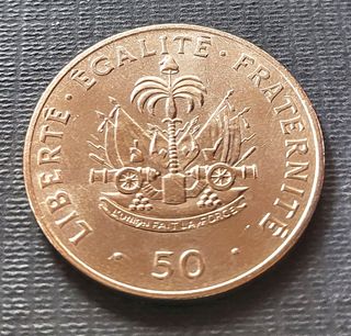 Moneda de Haití del año 1991. - Valor nominal de 50 centavos. - Diseño con el escudo nacional y lema. Asia, Africa, America, Europa, Oceania Mas monedas y billetes en mi perfil Hago envios de diferentes tipos