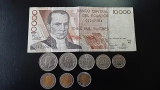 Conjunto de 8 monedas y un billete de Ecuador. El billete es de 10.000 Sucres, con fecha de 14 de diciembre de 1998, Serie AO. - Billete de 10.000 Sucres, Banco Central del Ecuador. - Moneda de 500 Sucres ( 1995 ). - 2 Monedas de 100 Sucre ( 1995 ). - 2 Monedas de 1 Sucre ( 1970/1977 ). - Moneda de 50 Centavos ( 1975 ). - Moneda de 20 Centavos ( 1974 ). - Moneda de 10 Centavos ( 1972 ). NO LO VENDO POR SEPARADO, LOTE EN CONJUNTO.