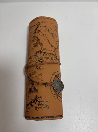 Estuche enrollable con diseño de mapa vintage. - Material de cuero sintético. - Cierre con cordón de cuero y detalle de moneda. - Diseño de mapa detallado impreso.