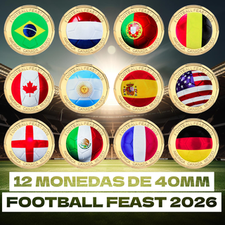 Colección de las 12 monedas conmemorativas del Football Feast 2026, cada una con un diámetro de 40mm. Cada moneda presenta un diseño de cada participante del torneo. Incluye América Canadá y México. - Diseño de balón de fútbol con banderas de los diferentes países. - Borde dorado con inscripciones. - Diámetro de 40mm. - Cápsulas protectoras incluidas. # futbol deporte equipación oficial entrada partido autógrafo balón Messi cristiano mbappe Lamine yamal real Madrid barsa Barcelona Bernabéu España champions ps5 PS4 Nintendo switch Xbox Apple iPhone iPad tablet Samsung Galaxy oferta gratuito envío rebajas