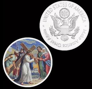 MONEDA BAÑADA EN PLATA DE JESÚS CARGANDO LA CRUZ