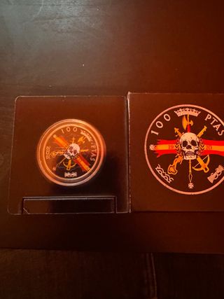 Moneda conmemorativa de 100 pesetas. - Diseño de calavera con espadas y escudo de la legión - Borde con corona y texto 100 PTAS. - Incluye detalles de la bandera española.