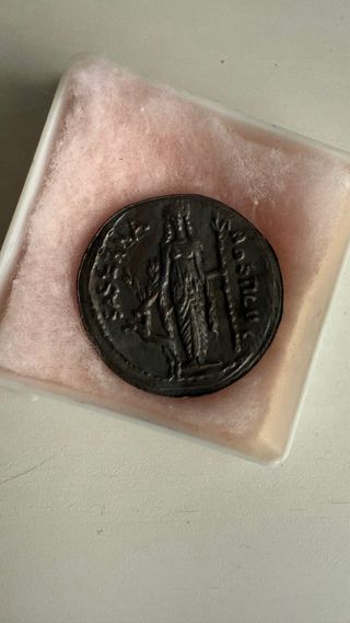 Moneda antigua de bronce de Constancio II. - Anverso: Busto de Constancio II. - Reverso: Figura femenina. - Inscripción parcial visible.
