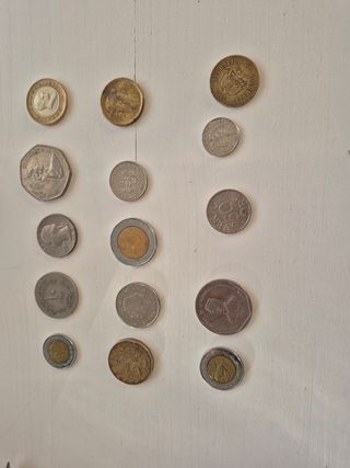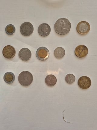 15 monedas de diferentes países. Egipto, Cuba, Republica Checa, Italia, Turquía, Estados Unidos, Paises Bajos,Colombia,Suecia México, República Dominicana, Reino Unido, Croacia.